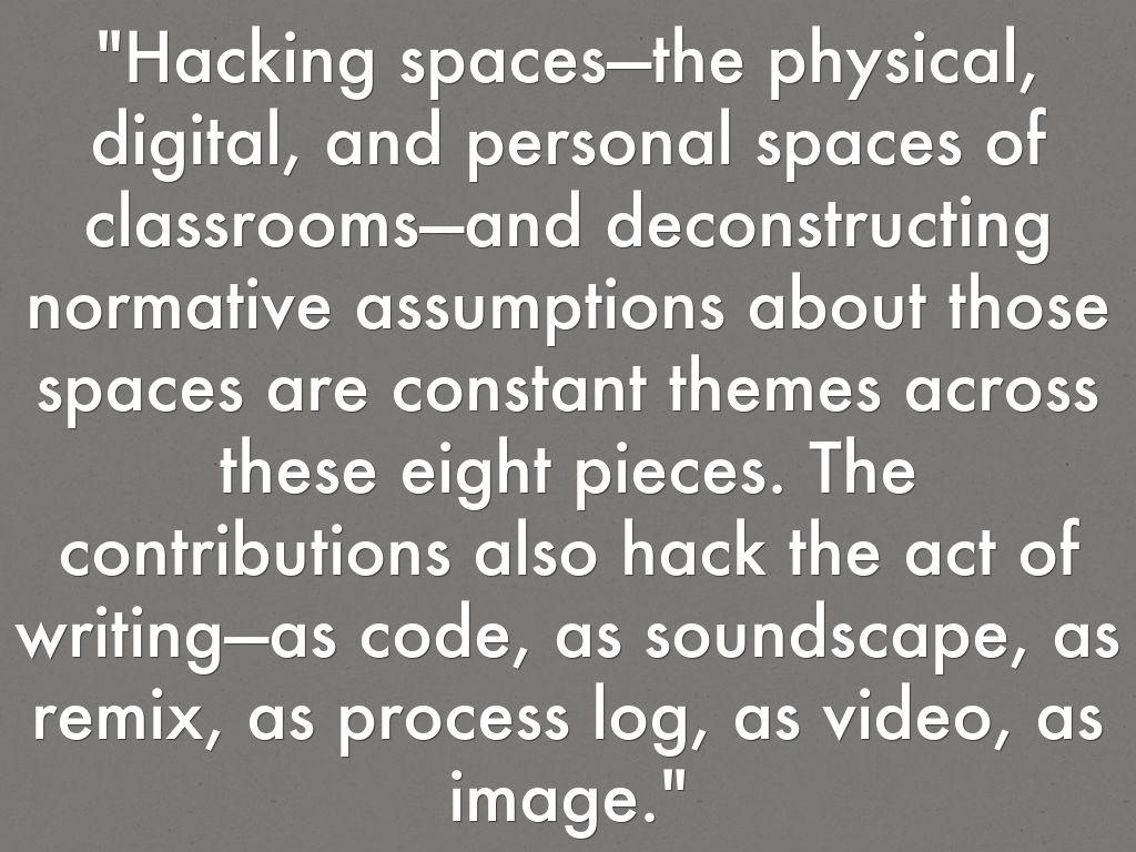 "Hacking spaces—the physical, digital, and personal spaces of classrooms—and deconstructing normative assumptions about those spaces are constant themes across these eight pieces. The contributions also hack the act of writing—as code, as soundscape, as remix, as process log, as video, as image."
