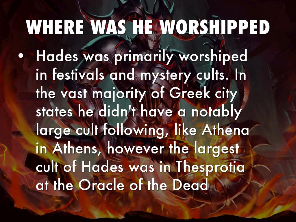 Hades was primarily worshiped in festivals and mystery cults. In the vast majority of Greek city states he didn't have a notably large cult following, like Athena in Athens, however the largest cult of Hades was in Thesprotia at the Oracle of the Dead
