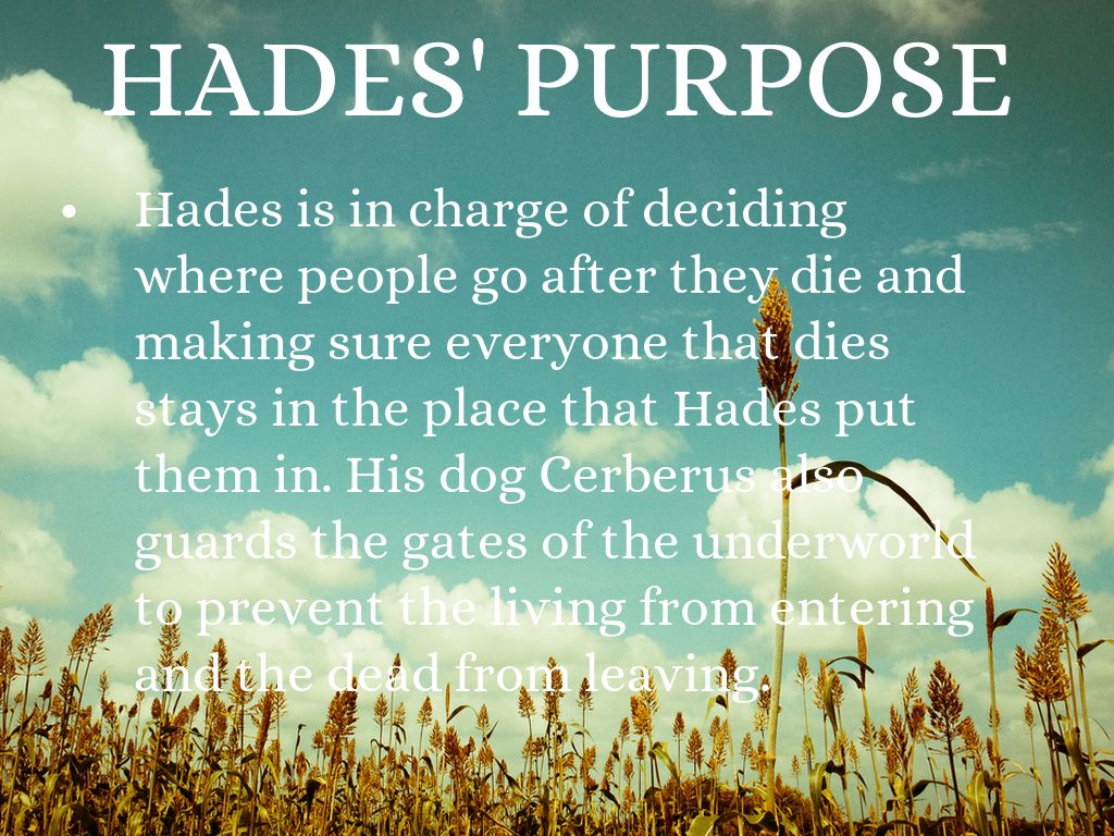 Hades is in charge of deciding where people go after they die and making sure everyone that dies stays in the place that Hades put them in. His dog Cerberus also guards the gates of the underworld to prevent the living from entering and the dead from leaving.