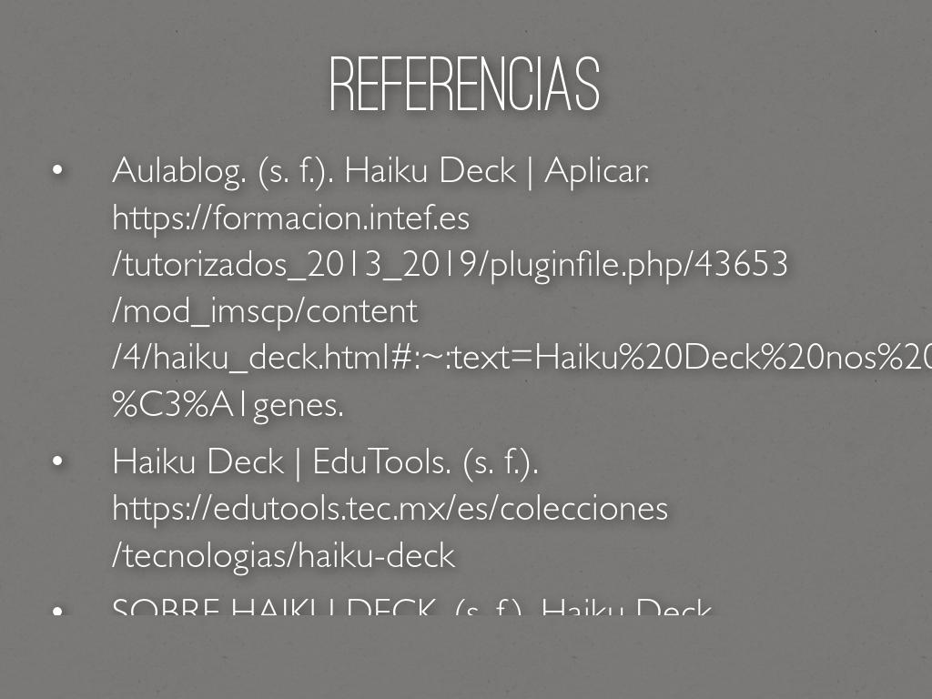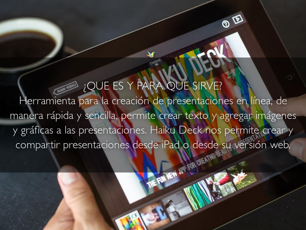 ¿QUE ES Y PARA QUE SIRVE? Herramienta para la creación de presentaciones en línea, de manera rápida y sencilla, permite crear texto y agregar imágenes y gráficas a las presentaciones. Haiku Deck nos permite crear y compartir presentaciones desde iPad o desde su versión web.