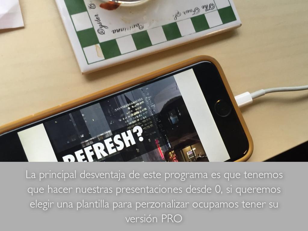 La principal desventaja de este programa es que tenemos que hacer nuestras presentaciones desde 0, si queremos elegir una plantilla para perzonalizar ocupamos tener su versión PRO