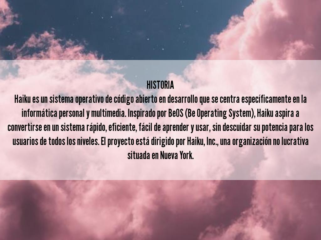 Haiku es un sistema operativo de código abierto en desarrollo que se centra específicamente en la informática personal y multimedia. Inspirado por BeOS (Be Operating System), Haiku aspira a convertirse en un sistema rápido, eficiente, fácil de aprender y usar, sin descuidar su potencia para los usuarios de todos los niveles. El proyecto está dirigido por Haiku, Inc., una organización no lucrativa situada en Nueva York.