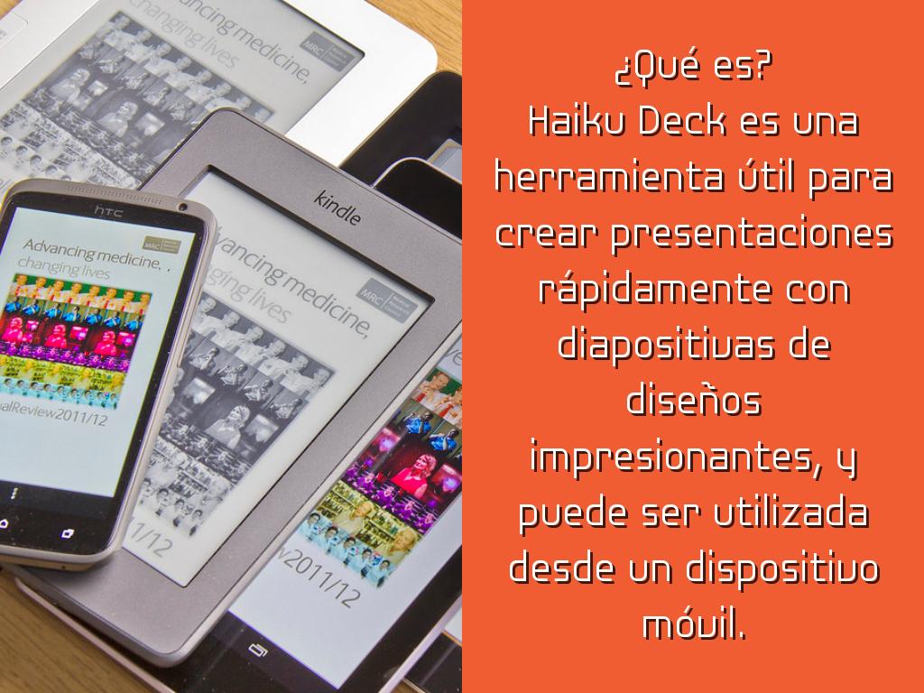 ¿Qué es? Haiku Deck es una herramienta útil para crear presentaciones rápidamente con diapositivas de diseños impresionantes, y puede ser utilizada desde un dispositivo móvil.