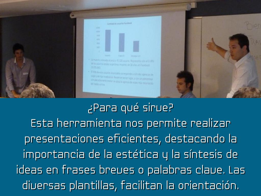 ¿Para qué sirve? Esta herramienta nos permite realizar presentaciones eficientes, destacando la importancia de la estética y la síntesis de ideas en frases breves o palabras clave. Las diversas plantillas, facilitan la orientación.
