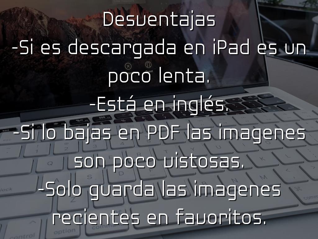 Desventajas -Si es descargada en iPad es un poco lenta. -Está en inglés. -Si lo bajas en PDF las imagenes son poco vistosas. -Solo guarda las imagenes recientes en favoritos.