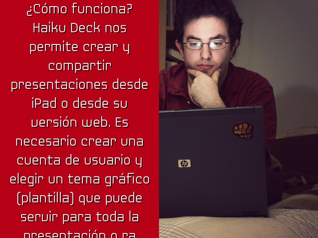 ¿Cómo funciona? Haiku Deck nos permite crear y compartir presentaciones desde iPad o desde su versión web. Es necesario crear una cuenta de usuario y elegir un tema gráfico (plantilla) que puede servir para toda la presentación o ra toda la presentación.