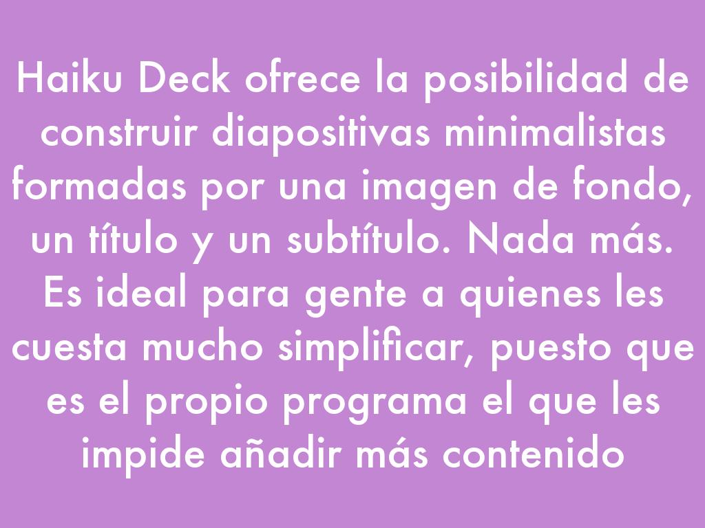 Haiku Deck ofrece la posibilidad de construir diapositivas minimalistas formadas por una imagen de fondo, un título y un subtítulo. Nada más. Es ideal para gente a quienes les cuesta mucho simplificar, puesto que es el propio programa el que les impide añadir más contenido