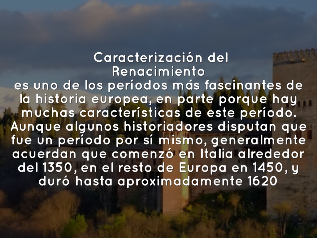es uno de los períodos más fascinantes de la historia europea, en parte porque hay muchas características de este período. Aunque algunos historiadores disputan que fue un período por sí mismo, generalmente acuerdan que comenzó en Italia alrededor del 1350, en el resto de Europa en 1450, y duró hasta aproximadamente 1620
