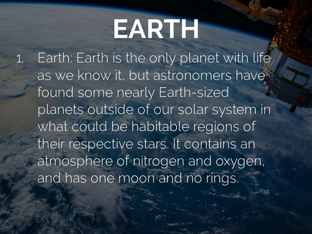 Earth: Earth is the only planet with life as we know it, but astronomers have found some nearly Earth-sized planets outside of our solar system in what could be habitable regions of their respective stars. It contains an atmosphere of nitrogen and oxygen, and has one moon and no rings.