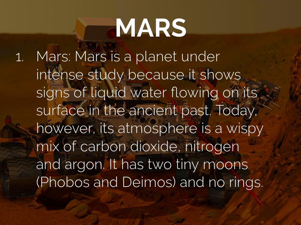 Mars: Mars is a planet under intense study because it shows signs of liquid water flowing on its surface in the ancient past. Today, however, its atmosphere is a wispy mix of carbon dioxide, nitrogen and argon. It has two tiny moons (Phobos and Deimos) and no rings.