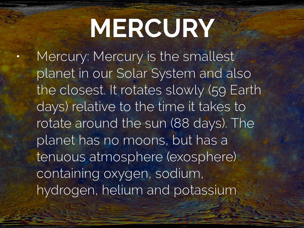 Mercury: Mercury is the smallest planet in our Solar System and also the closest. It rotates slowly (59 Earth days) relative to the time it takes to rotate around the sun (88 days). The planet has no moons, but has a tenuous atmosphere (exosphere) containing oxygen, sodium, hydrogen, helium and potassium