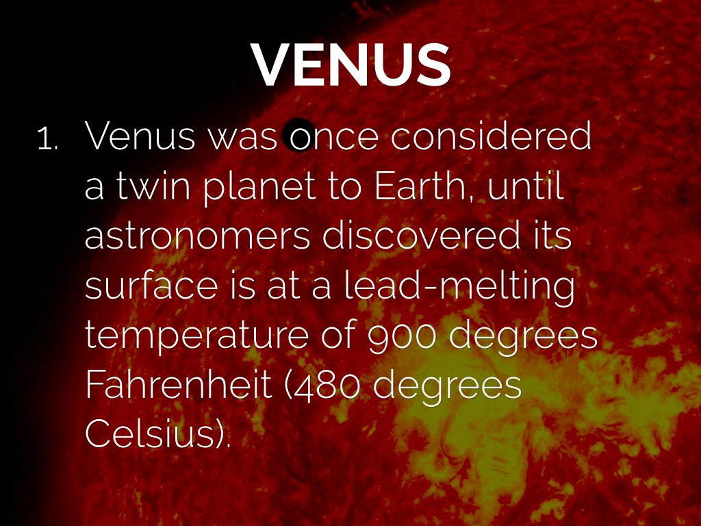 Venus was once considered a twin planet to Earth, until astronomers discovered its surface is at a lead-melting temperature of 900 degrees Fahrenheit (480 degrees Celsius).