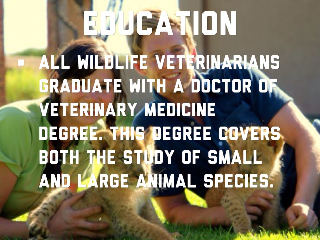 • All wildlife veterinarians graduate with a Doctor of veterinary medicine degree. This Degree covers both the study of small and large animal species.