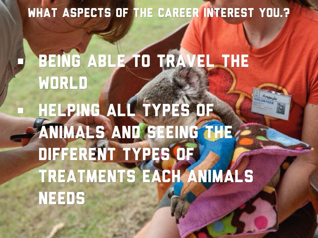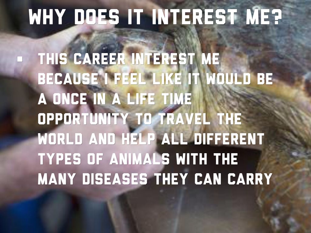 • This career interest me because I feel like it would be a once in a life time opportunity to travel the world and help all different types of animals with the many diseases they can carry
