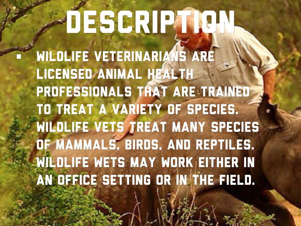 • Wildlife veterinarians are licensed animal health Professionals that are trained to treat a variety of species. Wildlife vets treat many species of mammals, birds, and reptiles. Wildlife wets may work either in an office setting or in the field.