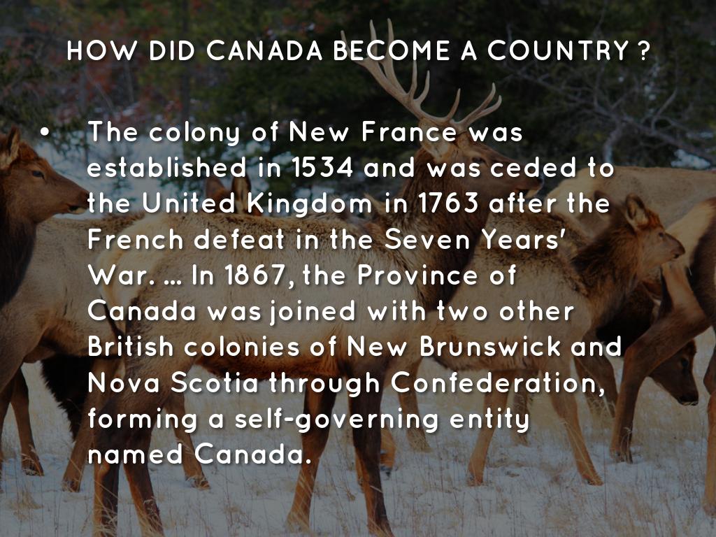 The colony of New France was established in 1534 and was ceded to the United Kingdom in 1763 after the French defeat in the Seven Years' War. ... In 1867, the Province of Canada was joined with two other British colonies of New Brunswick and Nova Scotia through Confederation, forming a self-governing entity named Canada.