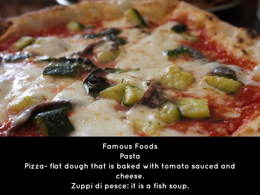Pizza- flat dough that is baked with tomato sauced and cheese.