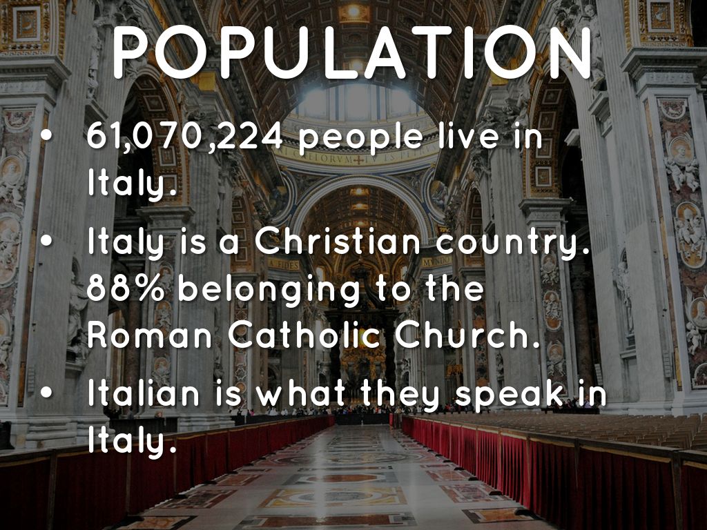 • Italy is a Christian country. 88% belonging to the Roman Catholic Church.