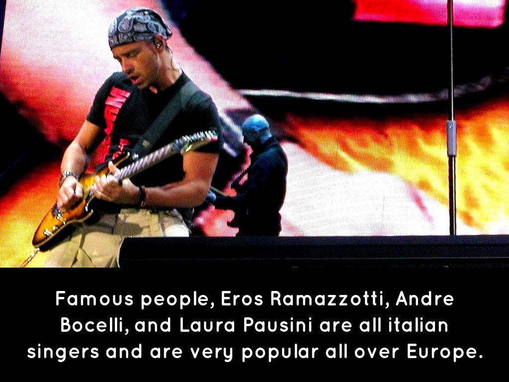 Famous people, Eros Ramazzotti, Andre Bocelli, and Laura Pausini are all italian singers and are very popular all over Europe.