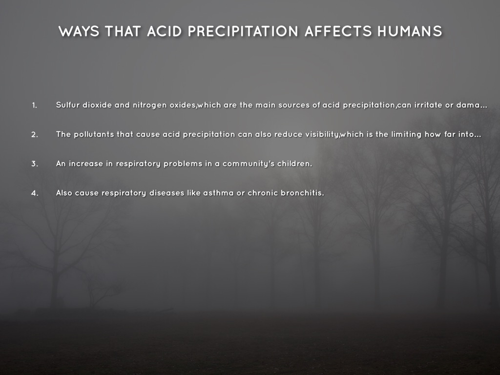 Also acid precipitation can cause a drop in the pH of soil and water.it causes aluminum and other toxic metals to be released and possibly absorbed by the roots of plants,causing root damage.also sulfur dioxides water vapor clogs the opening on the surfaces of plants.