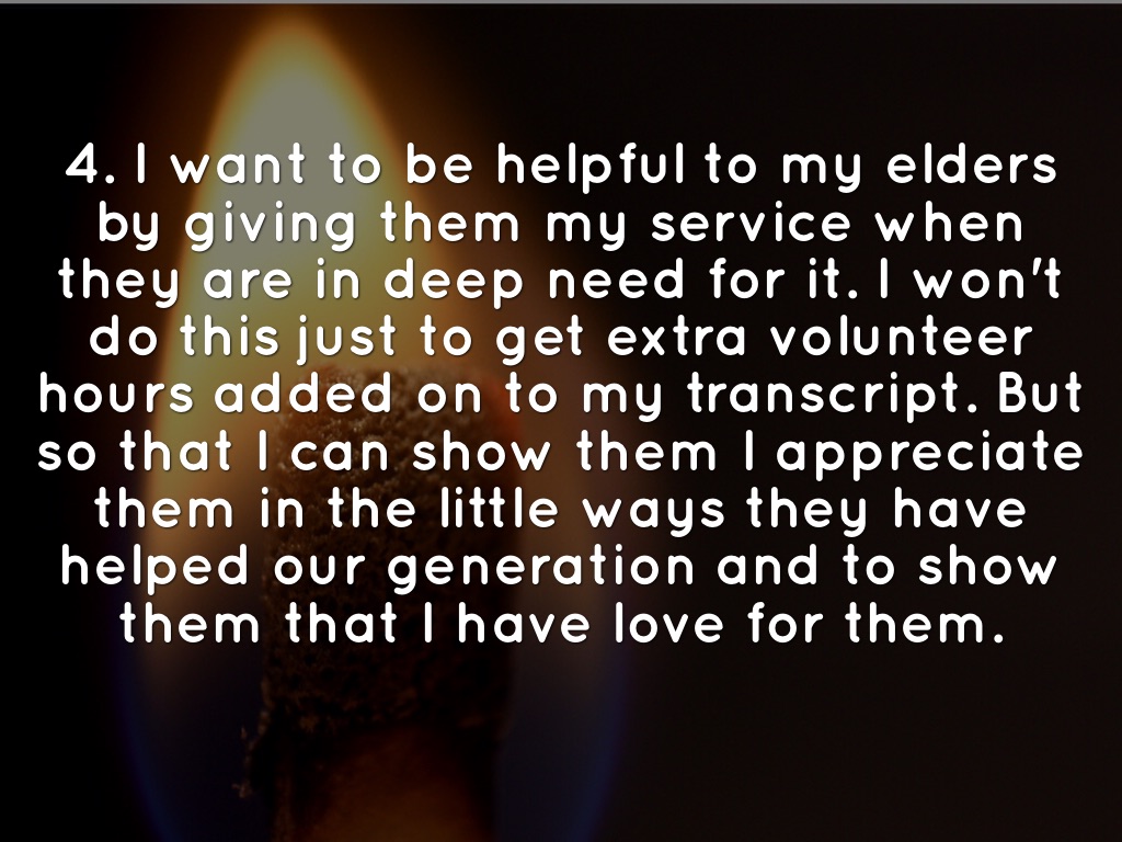 4. I want to be helpful to my elders by giving them my service when they are in deep need for it. I won't do this just to get extra volunteer hours added on to my transcript. But so that I can show them I appreciate them in the little ways they have helped our generation and to show them that I have love for them.