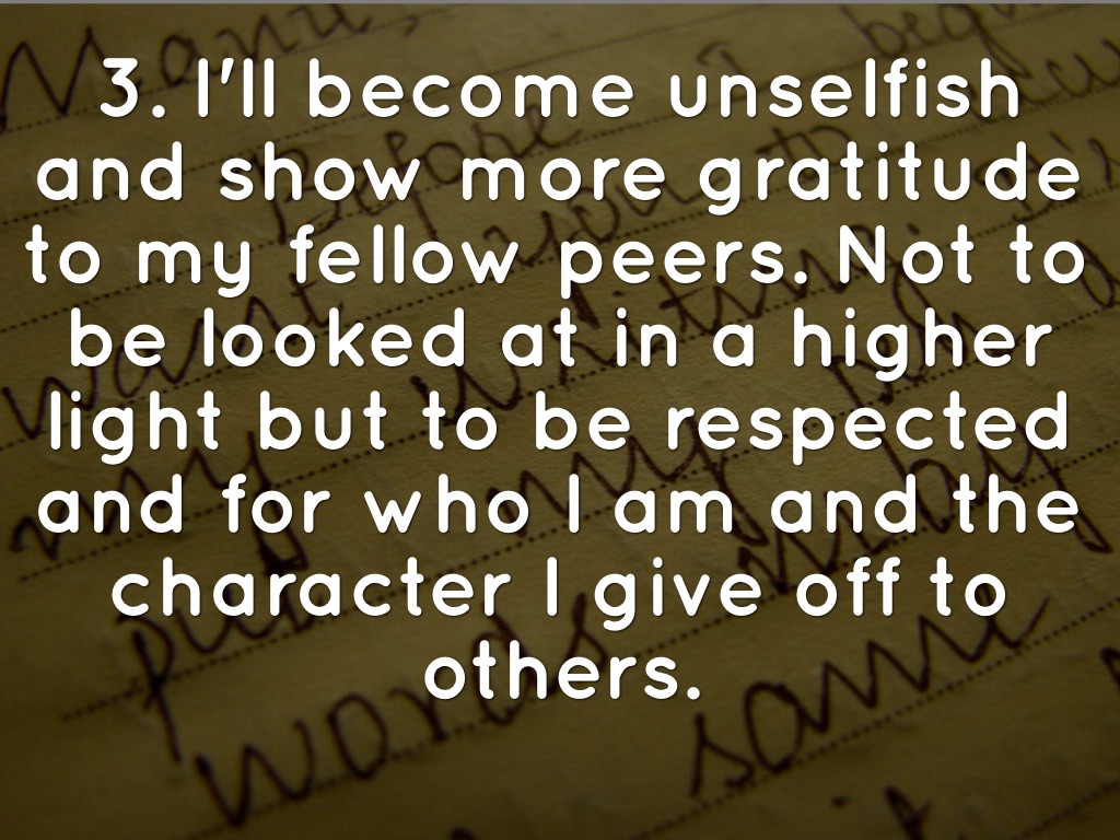 3. I'll become unselfish and show more gratitude to my fellow peers. Not to be looked at in a higher light but to be respected and for who I am and the character I give off to others.