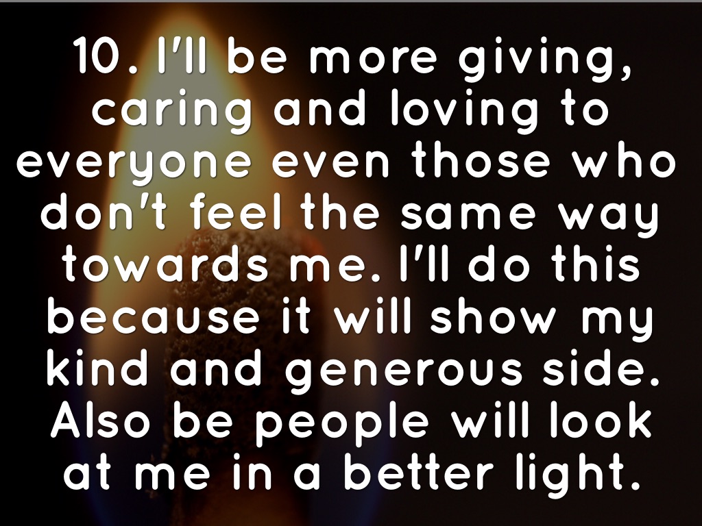 10. I'll be more giving, caring and loving to everyone even those who don't feel the same way towards me. I'll do this because it will show my kind and generous side. Also be people will look at me in a better light.