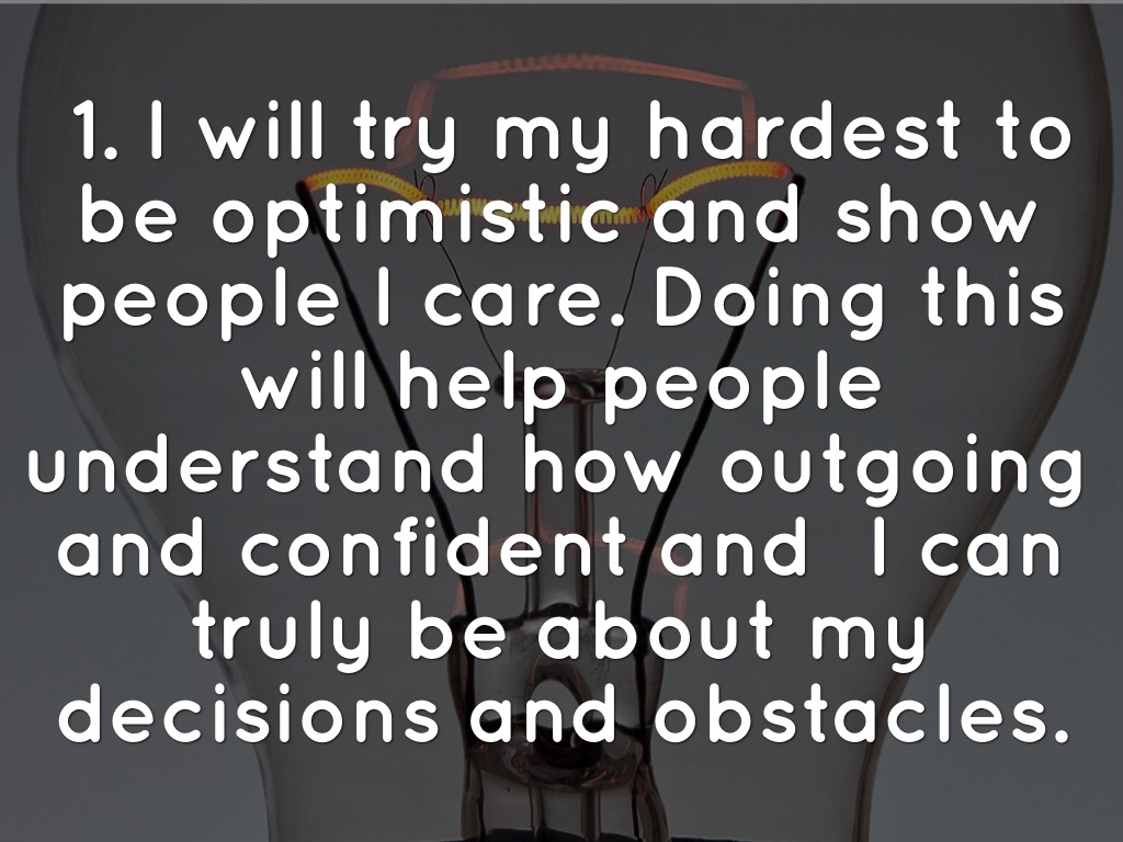 1. I will try my hardest to be optimistic and show people I care. Doing this will help people understand how outgoing and confident and I can truly be about my decisions and obstacles.