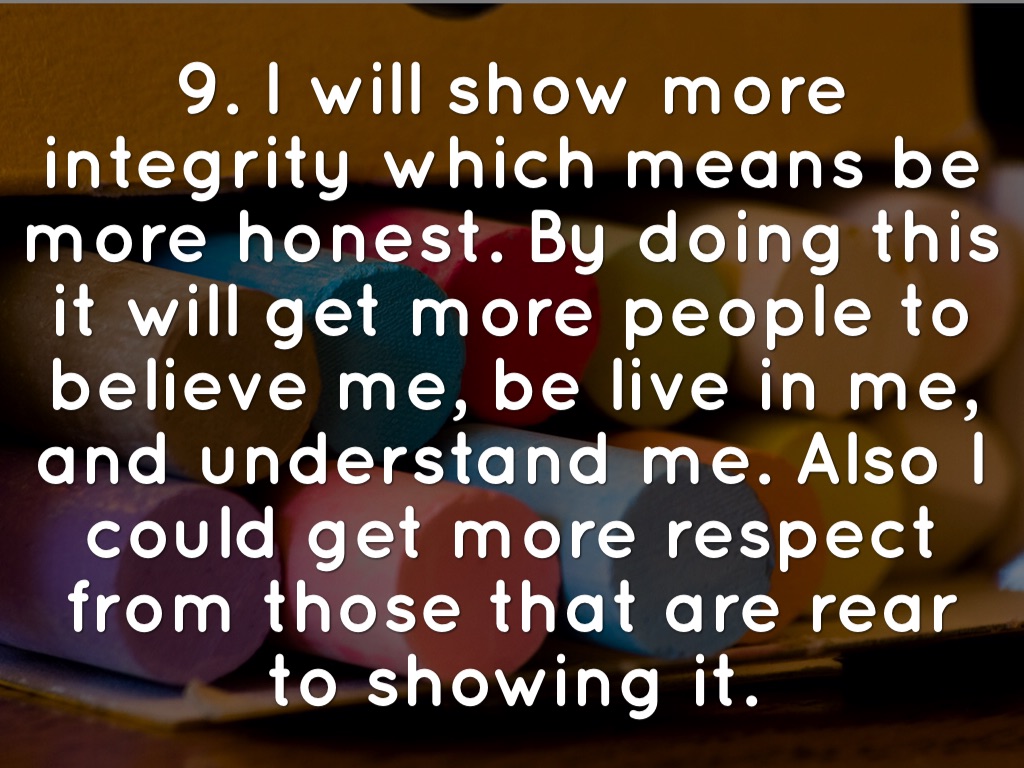 9. I will show more integrity which means be more honest. By doing this it will get more people to believe me, be live in me, and understand me. Also I could get more respect from those that are rear to showing it.