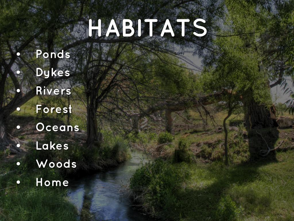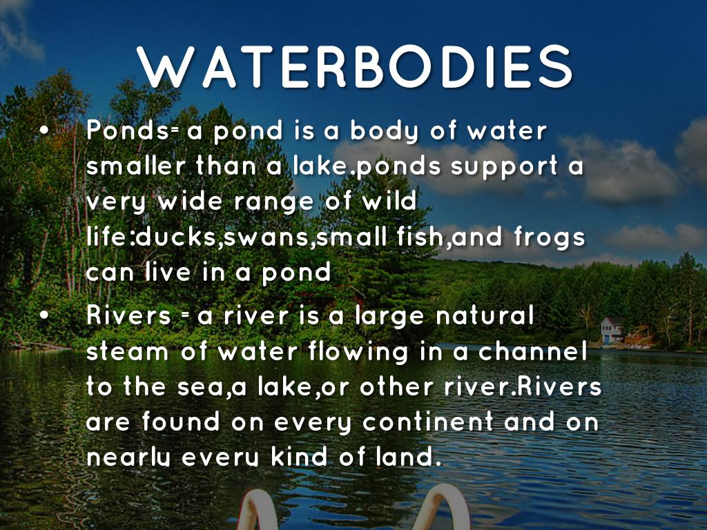 Ponds=a pond is a body of water smaller than a lake.ponds support a very wide range of wild life:ducks,swans,small fish,and frogs can live in a pond