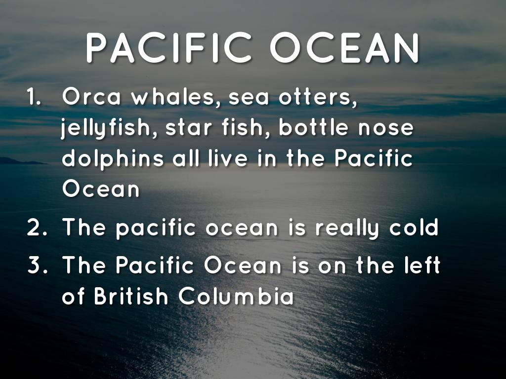 Orca whales, sea otters, jellyfish, star fish, bottle nose dolphins all live in the Pacific Ocean