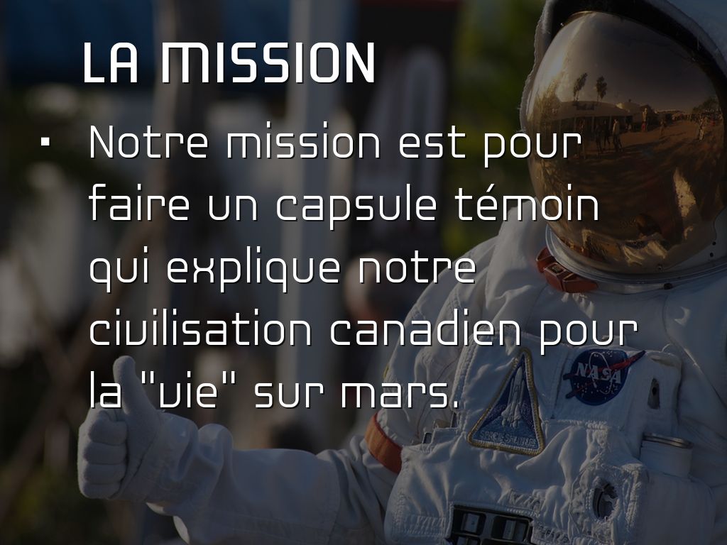 Notre mission est pour faire un capsule témoin qui explique notre civilisation canadien pour la "vie" sur mars.