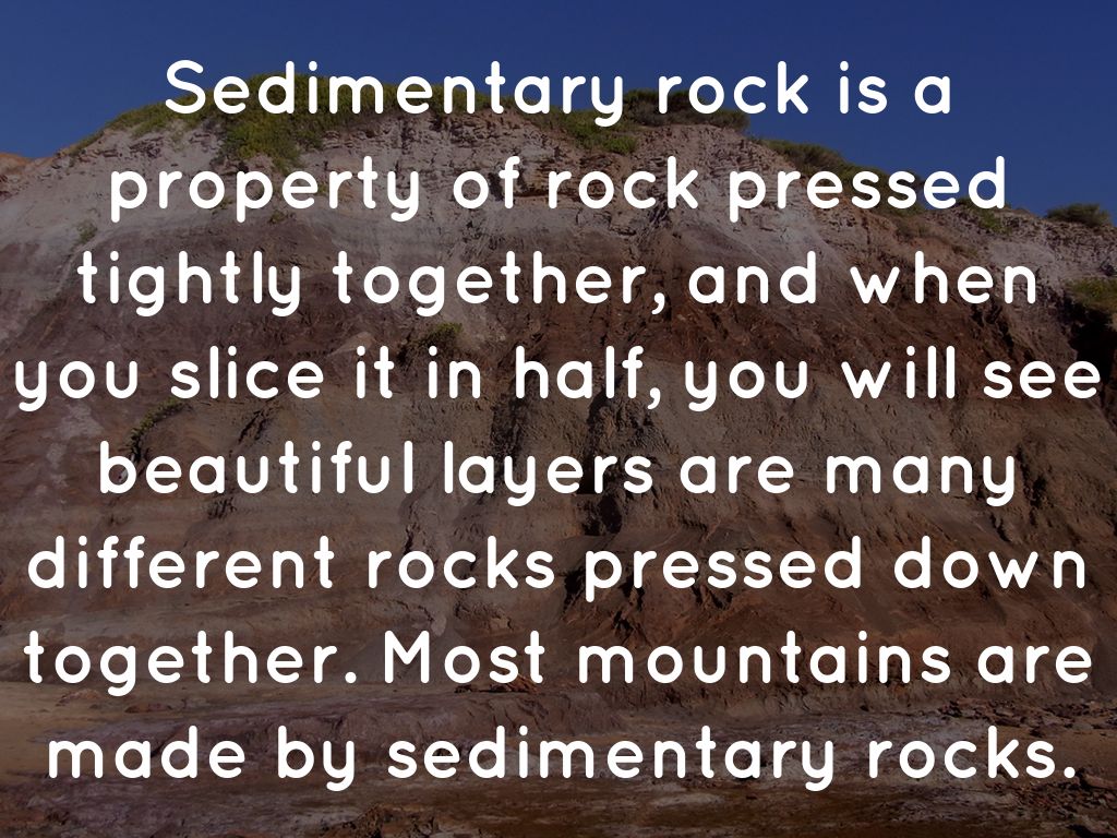 Sedimentary rock is a property of rock pressed tightly together, and when you slice it in half, you will see beautiful layers are many different rocks pressed down together. Most mountains are made by sedimentary rocks.