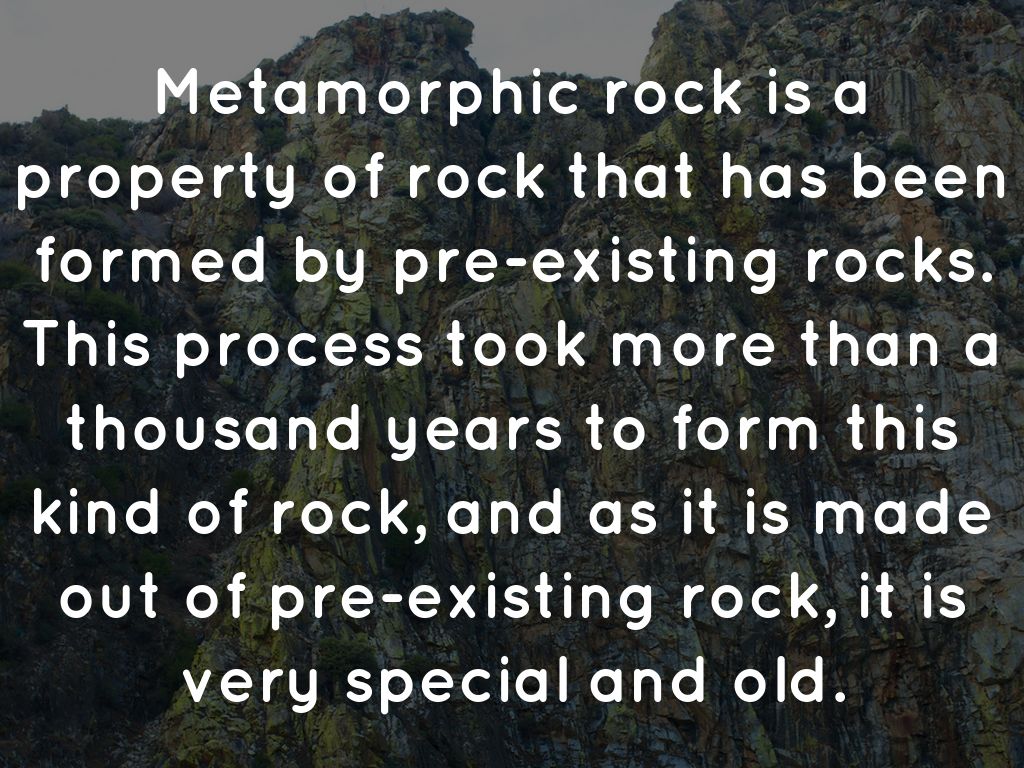 Metamorphic rock is a property of rock that has been formed by pre-existing rocks. This process took more than a thousand years to form this kind of rock, and as it is made out of pre-existing rock, it is very special and old.
