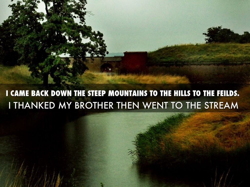 I CAME BACK DOWN THE STEEP MOUNTAINS TO THE HILLS TO THE FEILDS.