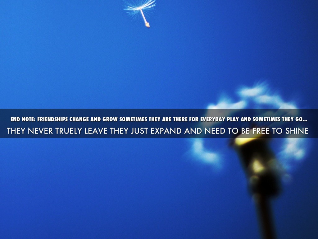 END NOTE: FRIENDSHIPS CHANGE AND GROW SOMETIMES THEY ARE THERE FOR EVERYDAY PLAY AND SOMETIMES THEY GO...