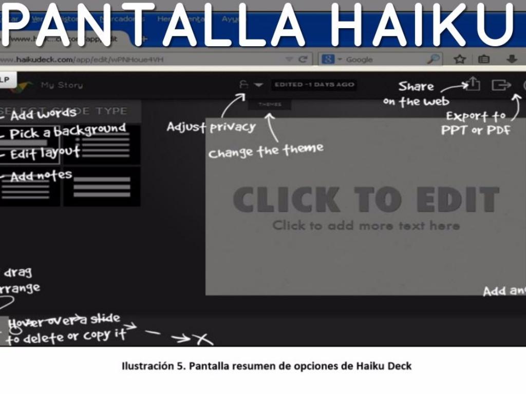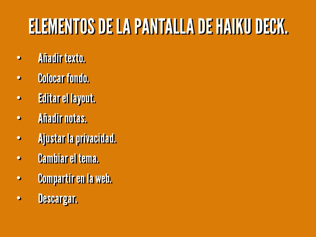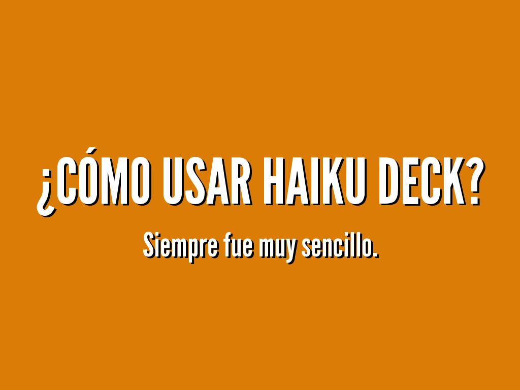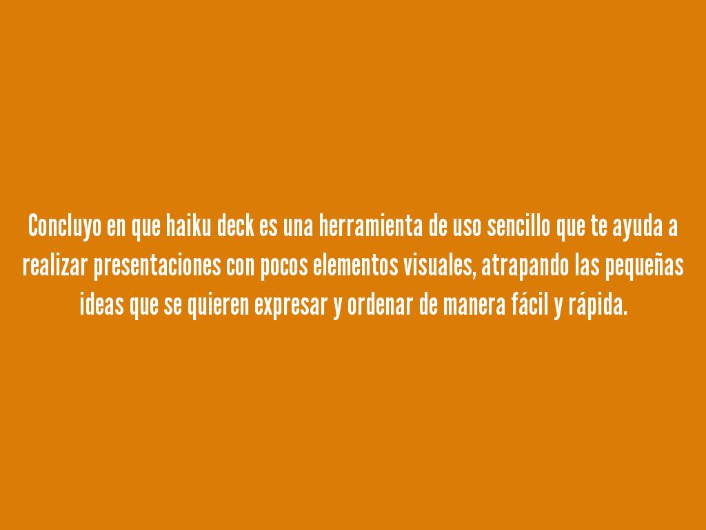 Concluyo en que haiku deck es una herramienta de uso sencillo que te ayuda a realizar presentaciones con pocos elementos visuales, atrapando las pequeñas ideas que se quieren expresar y ordenar de manera fácil y rápida.