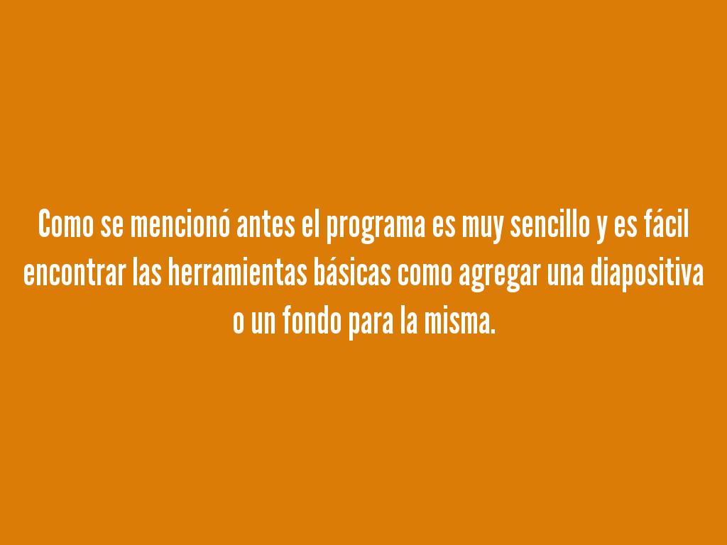 Como se mencionó antes el programa es muy sencillo y es fácil encontrar las herramientas básicas como agregar una diapositiva o un fondo para la misma.
