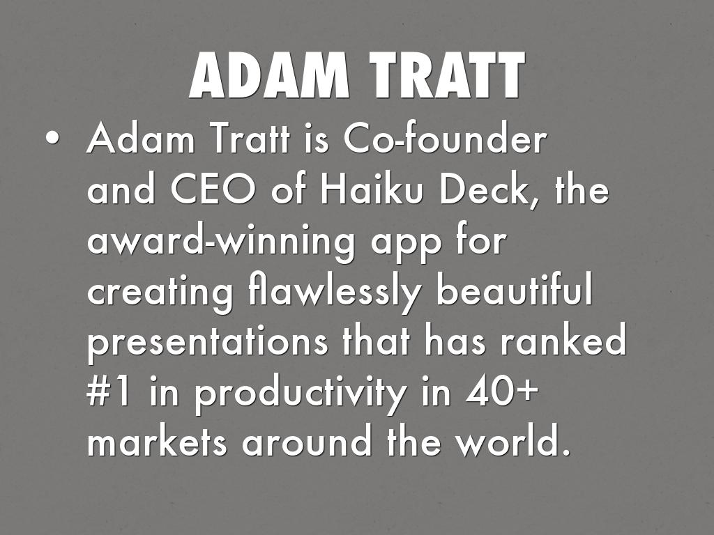 • Adam Tratt is Co-founder and CEO of Haiku Deck, the award-winning app for creating flawlessly beautiful presentations that has ranked #1 in productivity in 40+ markets around the world.