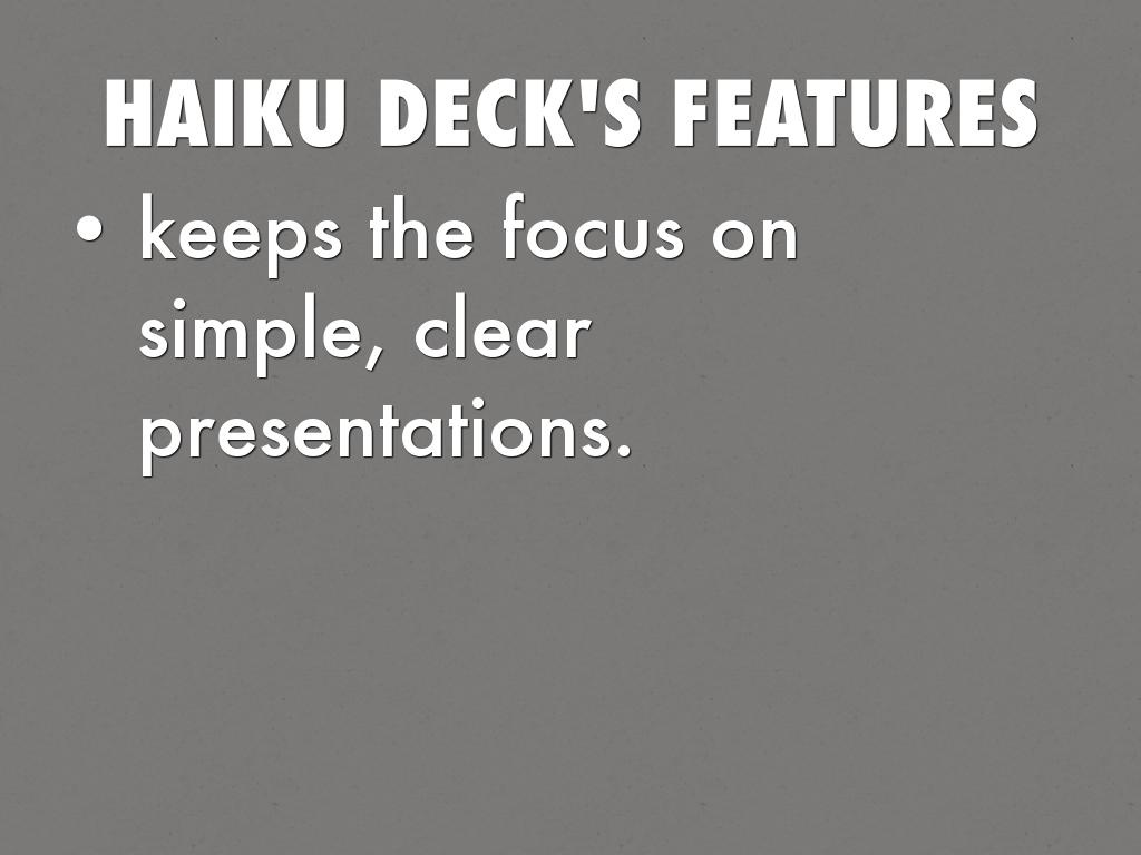 • Haiku Deck is a presentation creation website and app (for iOS) that uses images, text, audio, and video to make impactful presentations with "decks" of slides.