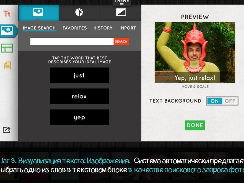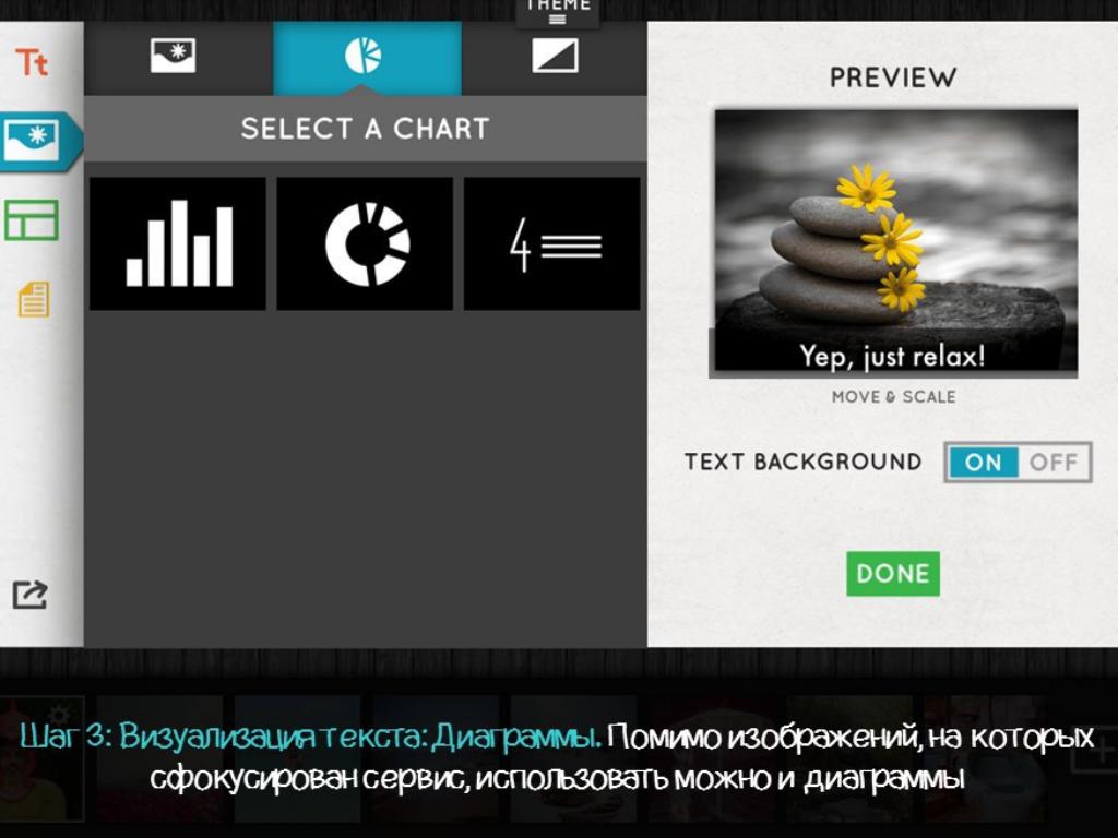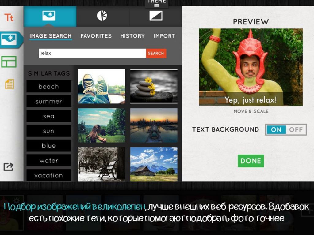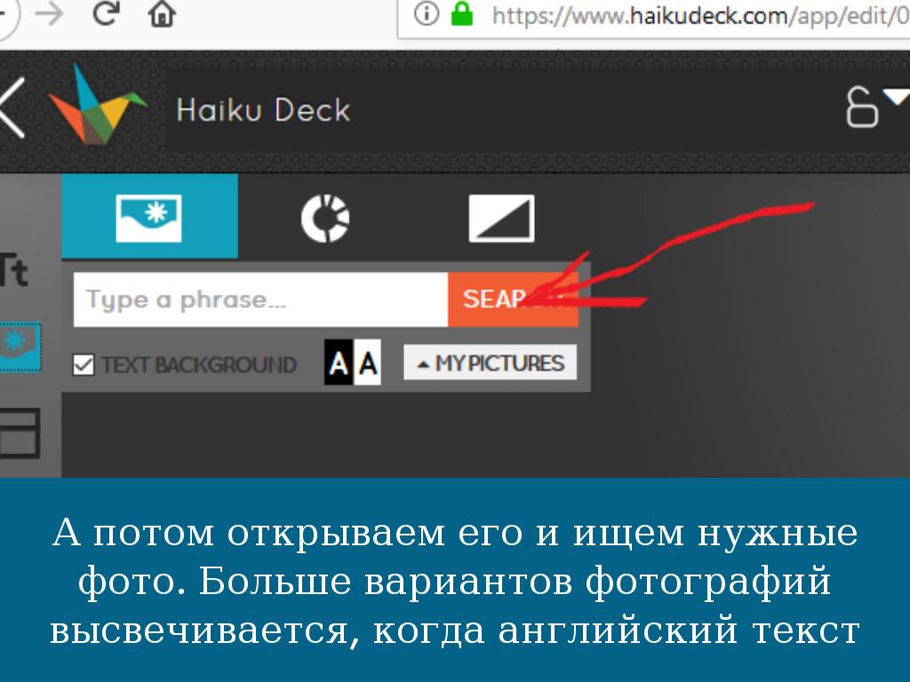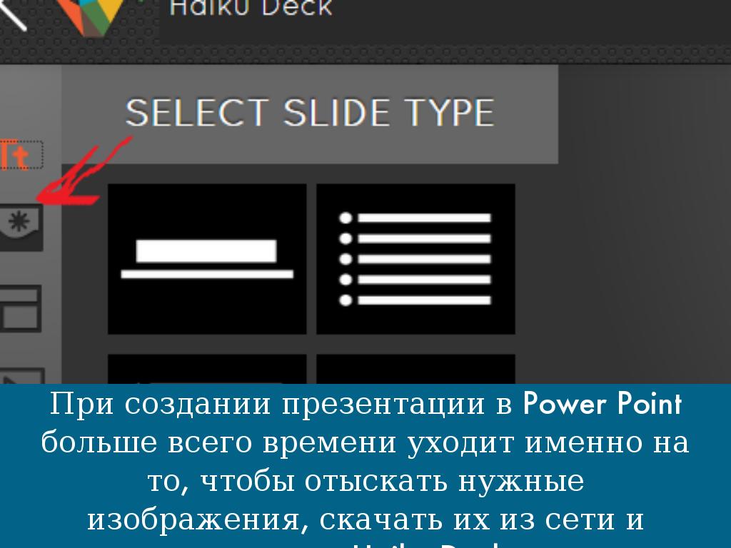 При создании презентации в Power Point больше всего времени уходит именно на то, чтобы отыскать нужные изображения, скачать их из сети и встроить в проект. Haiku Deck делает это за несколько секунд. Сначала ищем значок фотографии