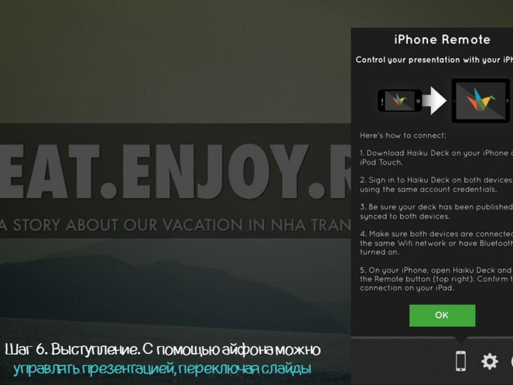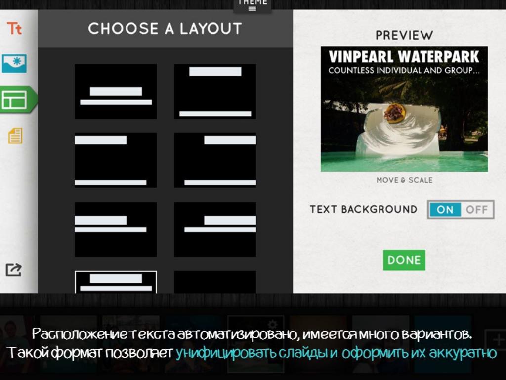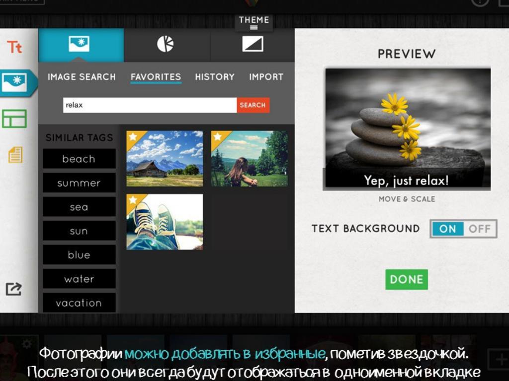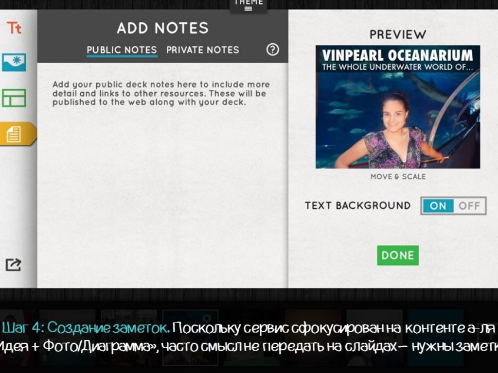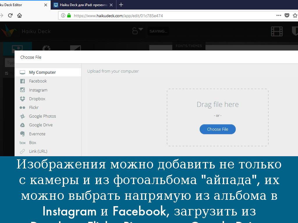 При создании презентации в Power Point больше всего времени уходит именно на то, чтобы отыскать нужные изображения, скачать их из сети и встроить в проект. Haiku Deck делает это за несколько секунд. Сначала ищем значок фотографии