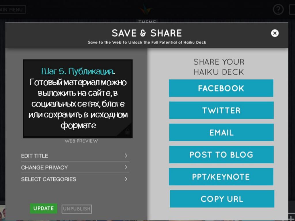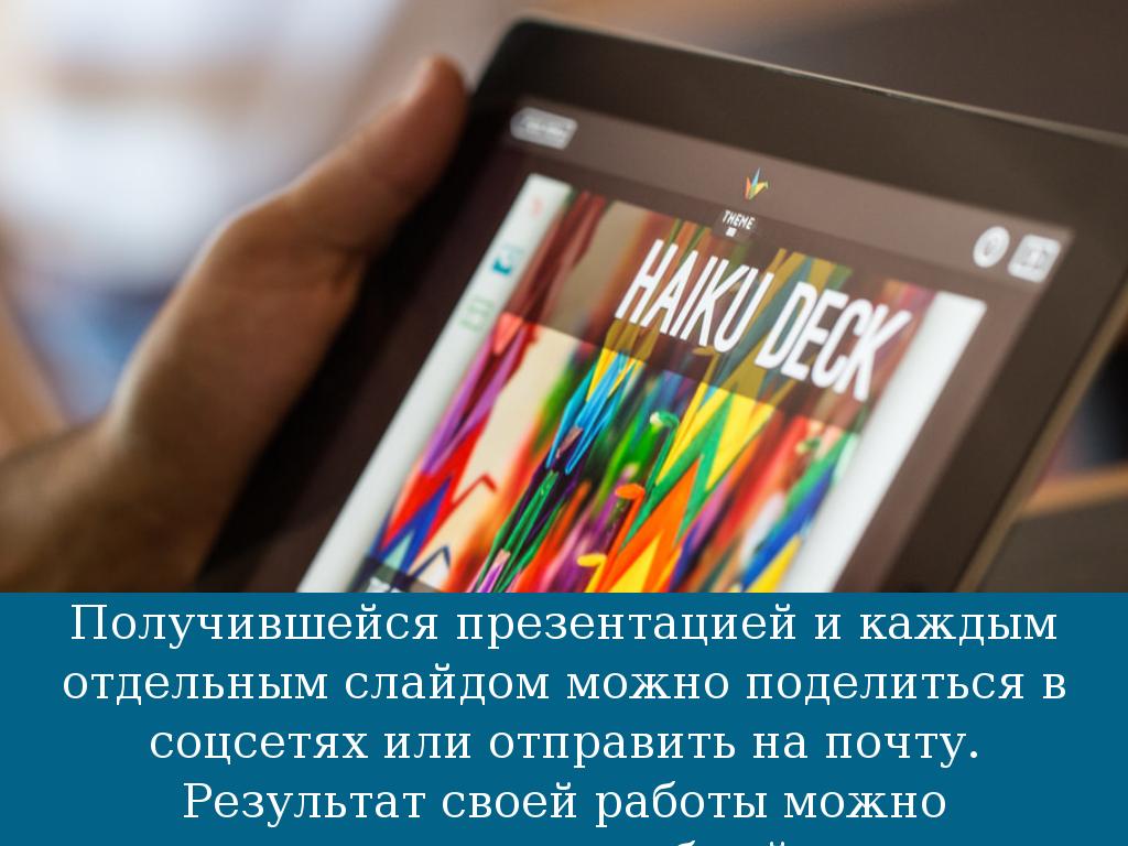 Получившейся презентацией и каждым отдельным слайдом можно поделиться в соцсетях или отправить на почту. Результат своей работы можно встраивать на веб-сайты, демонстрировать на планшете или смартфоне, проигрывать на проекторе и так далее.