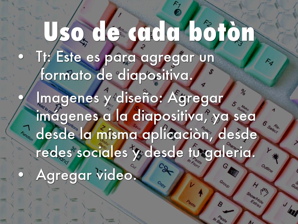 • Imagenes y diseño: Agregar imágenes a la diapositiva, ya sea desde la misma aplicaciòn, desde redes sociales y desde tu galeria.