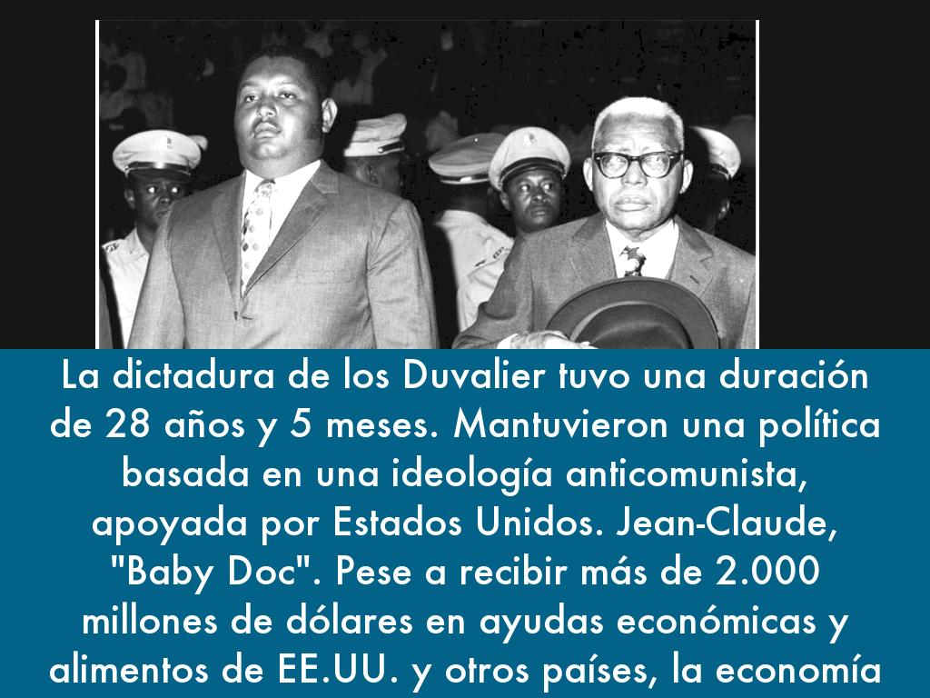 La dictadura de los Duvalier tuvo una duración de 28 años y 5 meses. Mantuvieron una política basada en una ideología anticomunista, apoyada por Estados Unidos. Jean-Claude, "Baby Doc". Pese a recibir más de 2.000 millones de dólares en ayudas económicas y alimentos de EE.UU. y otros países, la economía del pueblo haitiano cayó en picada, acumulando deudas con el Banco Mundial.