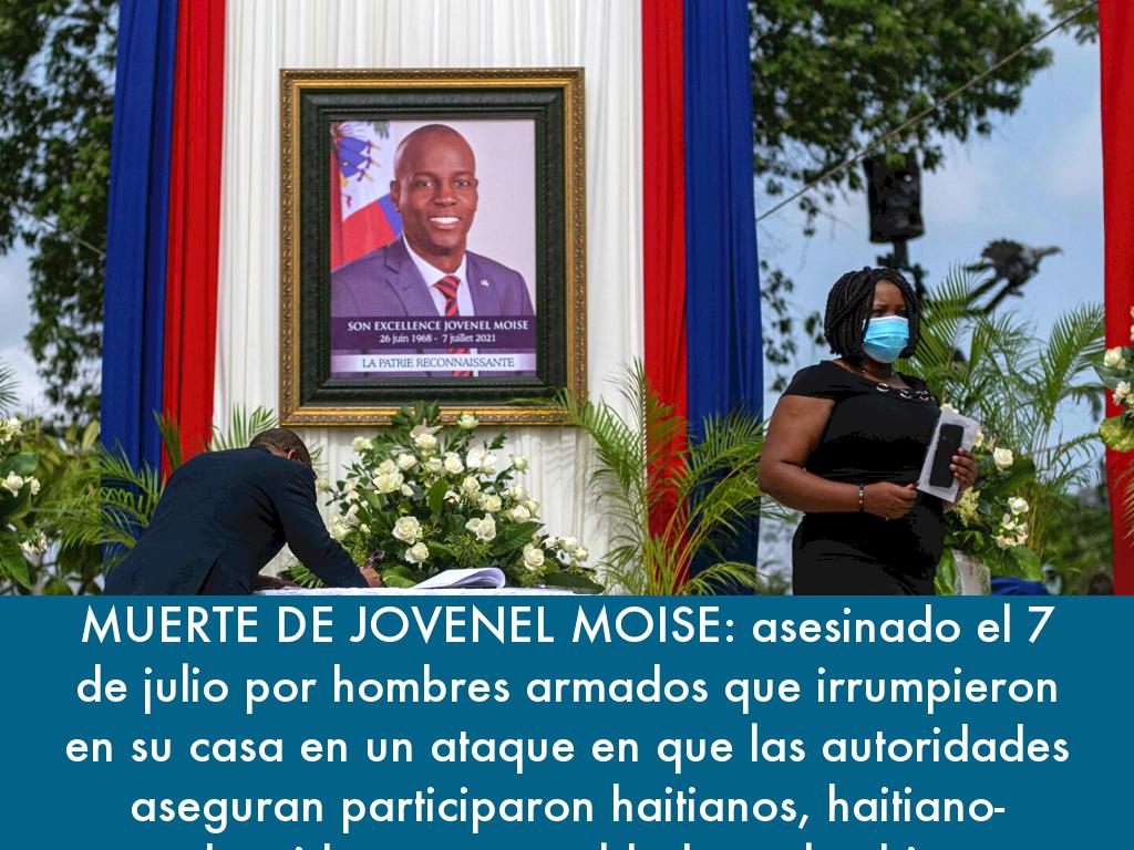 MUERTE DE JOVENEL MOISE: asesinado el 7 de julio por hombres armados que irrumpieron en su casa en un ataque en que las autoridades aseguran participaron haitianos, haitiano-estadounidenses y exsoldados colombianos.