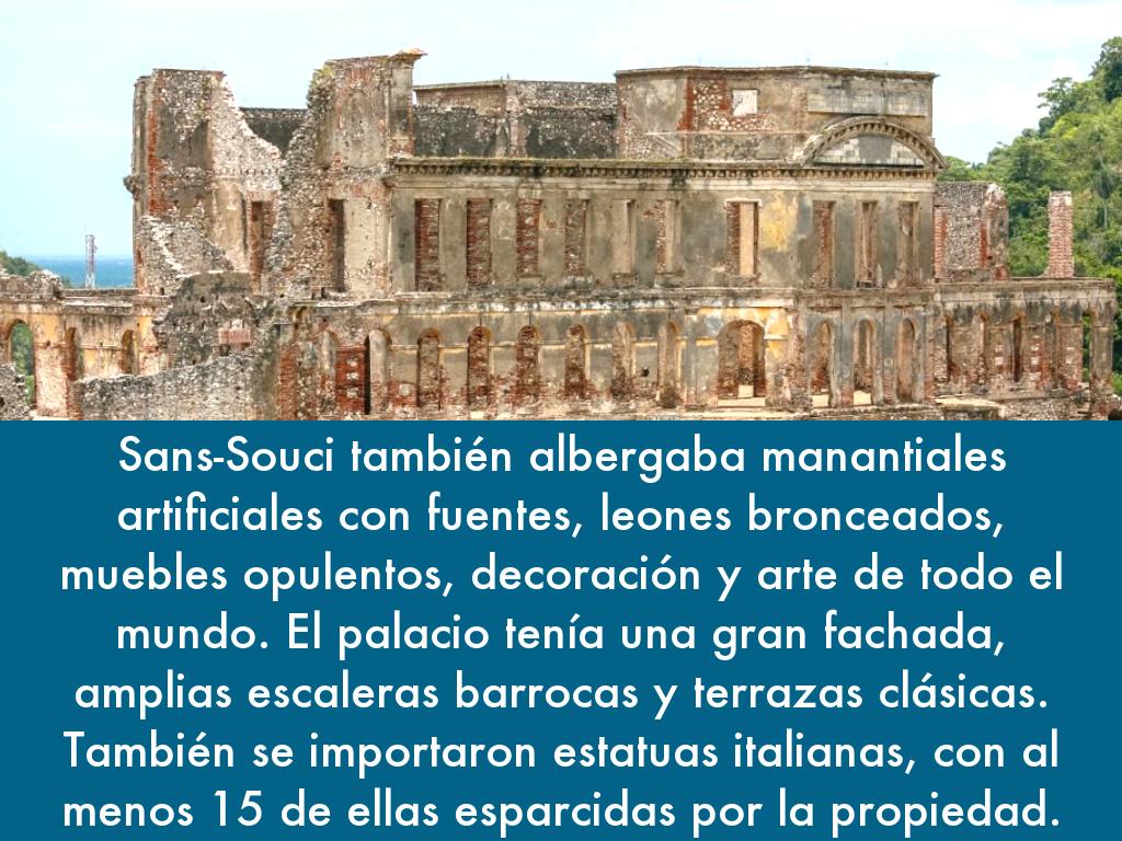 Sans-Souci también albergaba manantiales artificiales con fuentes, leones bronceados, muebles opulentos, decoración y arte de todo el mundo. El palacio tenía una gran fachada, amplias escaleras barrocas y terrazas clásicas. También se importaron estatuas italianas, con al menos 15 de ellas esparcidas por la propiedad.
