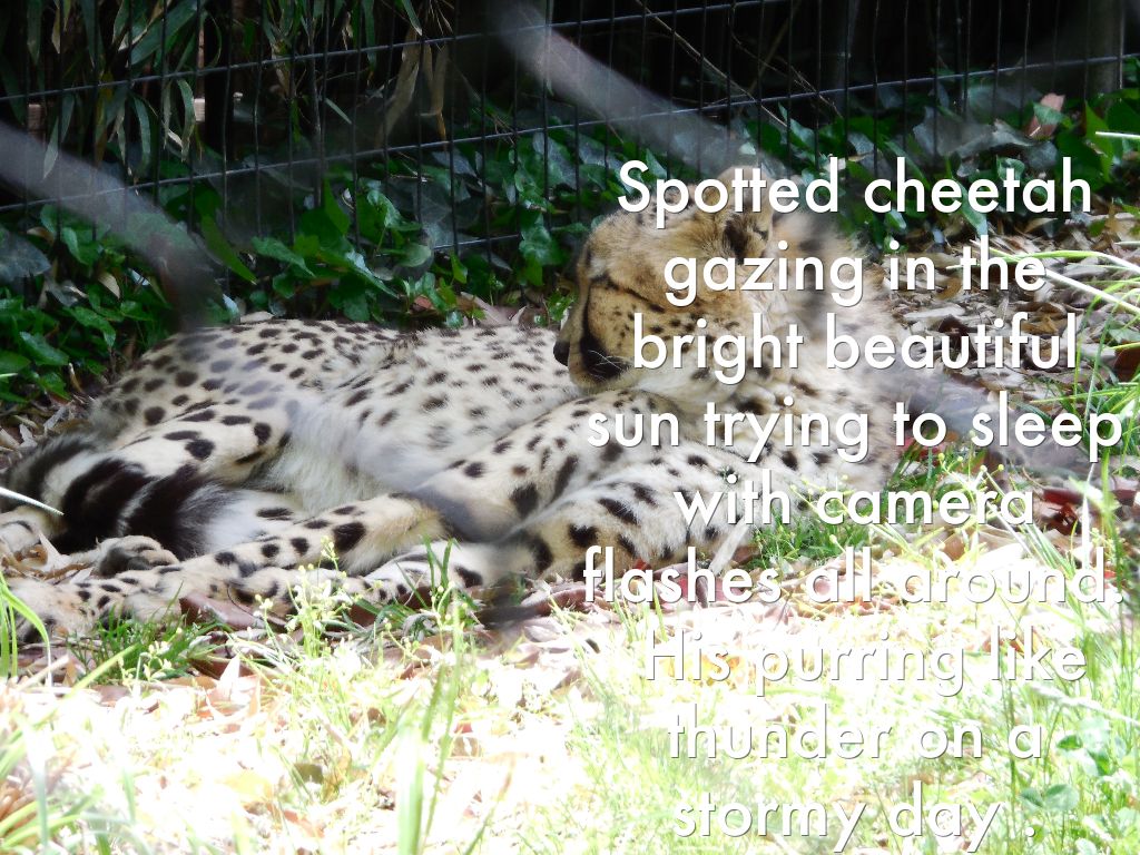 Spotted cheetah gazing in the bright beautiful sun trying to sleep with camera flashes all around. His purring like thunder on a stormy day .