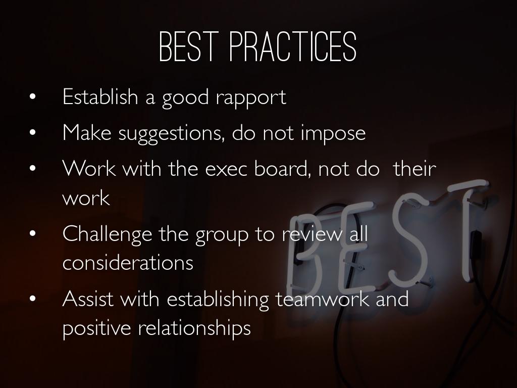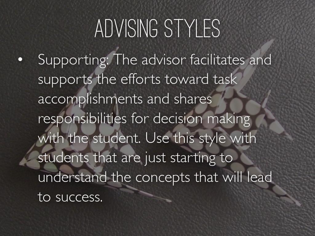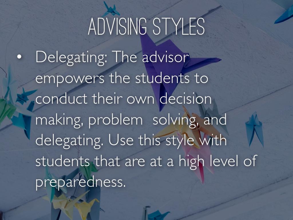 Delegating: The advisor empowers the students to conduct their own decision making, problem