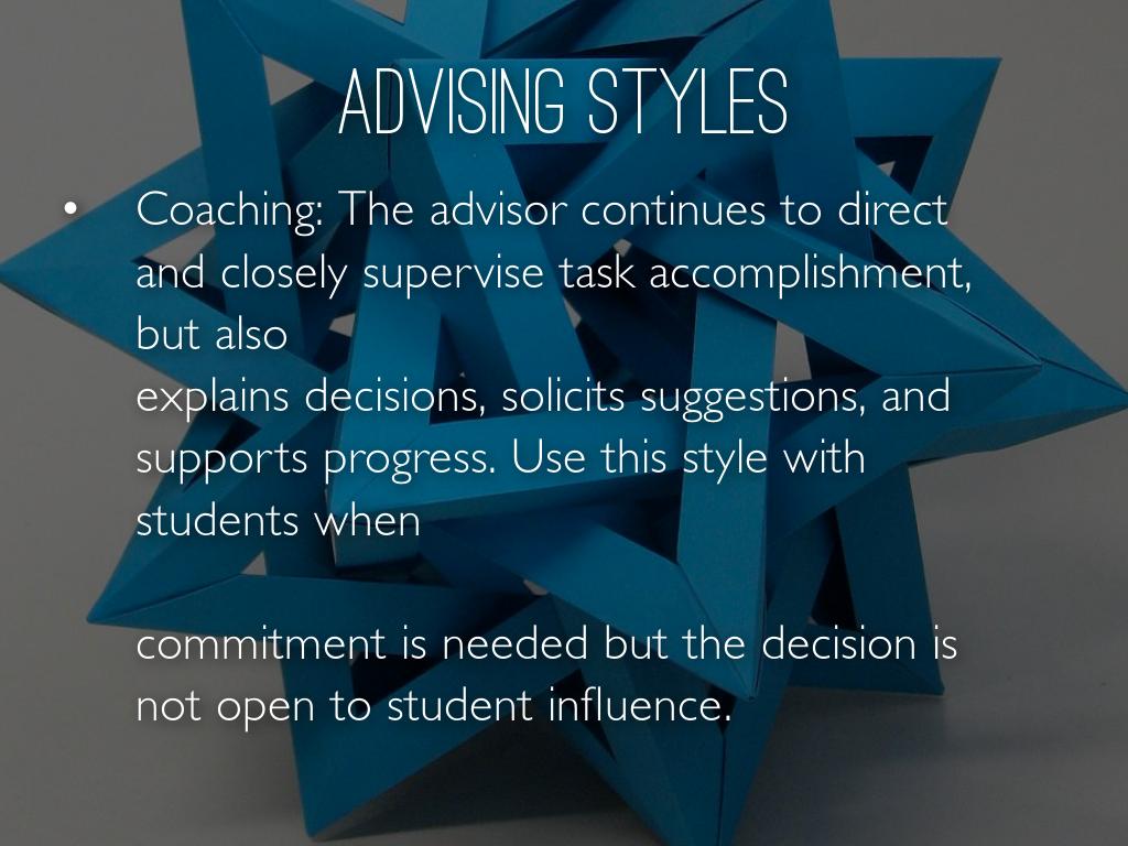 Coaching: The advisor continues to direct and closely supervise task accomplishment, but also